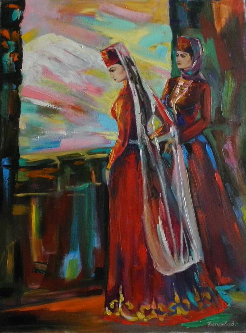 Несколько слов следует сказать о картине «Аланка». Я бы сказала, «Аланка» с глазами инопланетянки. Абсолютно живое лицо, строгий, взыскующий взгляд, обращенный… Интересно, на кого? Иногда возникает ощущение, что в некоторых женских образах на картинах Зульфии улавливается портретное сходство с автором. Говорят также, что девушки в картинах «Ожидание» похожи на ее сестер, таких же красавиц, как и сама героиня нашего рассказа, прекрасных классической красотой горянок. Но не только женская красота угадывается в этой картине - здесь можно написать в своем воображении целый рассказ. Кого ждут эти стройные девушки у окна, с тревогой и некоторым нетерпением вглядываясь вдаль? Ждут ли они брата? Или отца? Или еще кого-то, кто бесконечно дорог сердцу?