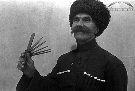 1936 год. Жабоев М. из селения Нижний Хулам за игрой на сыбызгъы