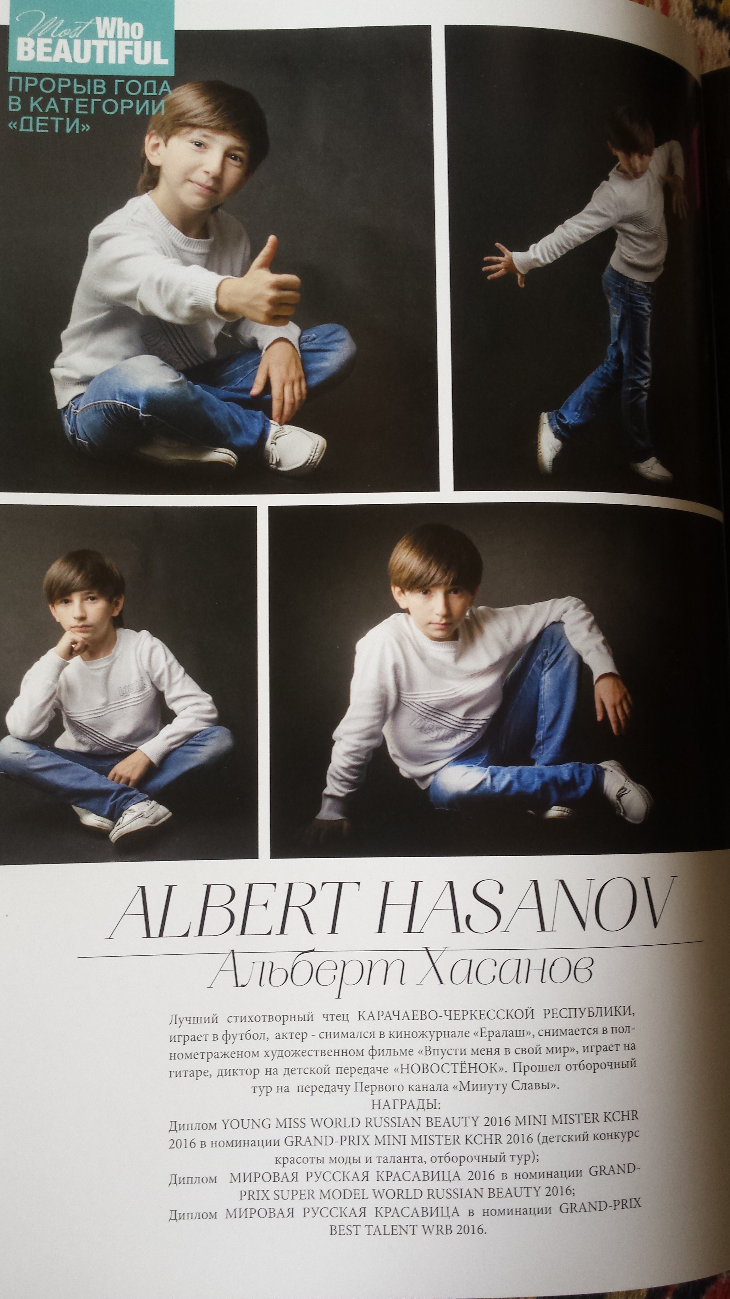 Они принимали участие в конкурсе «Красота, мода, талант» с программой показа национальной одежды, строгих костюмов и вечерних платьев. Также был и творческий конкурс, где Альберт блестяще декламировал стихи и исполнил зажигательный национальный танец собственной постановки. Лейла удивила всех зрителей и жюри чтением скороговорки, продолжительность которой длилась почти 3 минуты. Оба они заняли Гран-при «Недели моды» и получили титулы «Мисс КЧР» и «Мини-Мистер КЧР». Лейла Хасанова получила сертификат на 30 тысяч рублей, Альберту был вручен сертификат на 60 тысяч рублей – эта сумма стала вступительным взносом для участия в Московском Фестивале «World Russian Beauty 2016», который состоялся в сентябре того же года. В нём приняло участие более 100 конкурсантов более чем из 50 организаций и компаний 12 стран.
