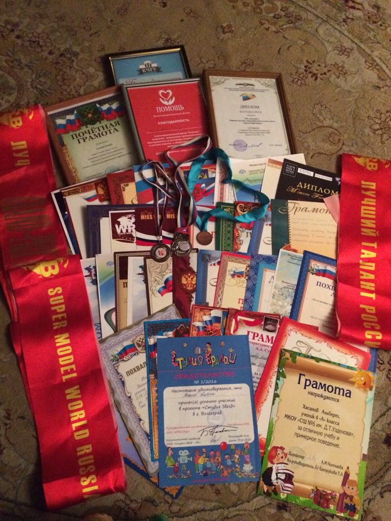 Еще в 2013 году, будучи первоклассником, Альберт занял 1-е место в городском конкурсе чтецов и после был направлен на более масштабный конкурс в Черкесск, где он не стал делить первое место с девочкой из Детского Дома и взял диплом второй степени. Далее мальчик участвовал во всех городских и школьных конкурсах, где получал высшие награды. Во 2-м классе Альберт занял 1-е место за исследовательскую работу под названием «Лимон», за которую также был отмечен высшим призовым местом в школе и в общегородском конкурсе научно-исследовательских работ учеников.