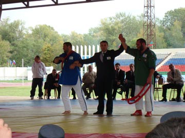 - Учитывая то, что на Кубке мира абсолютного первенства не бывает, - подчеркнул Мустафа Азрет-Алиевич, - лучшему борцу, первому и пока единственному заслуженному мастеру спорта по борьбе на поясах, человеку, благодаря которому стало возможным провести в нашей республике Кубок по борьбе на поясах, Ринату Акбаеву присудить звание абсолютного чемпиона сегодняшнего Кубка!