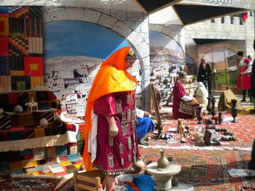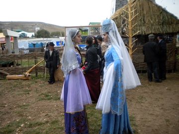 Не уступал ставропольскому двору по красочности и дагестанский майдан, "мостовая" которого была устлана узорными коврами, заставлена кувшинами всех размеров и форм, изделиями знаменитых кубачинских мастеров и глиняными статуэтками. Гости подворья с любопытством рассматривали национальные костюмы дагестанцев. Особенно "досталось" платью, сверху донизу увешанному массивными серебряными подвесками. Оказалось, такой необычный наряд надевают в день замужества девушки, живущие у подножья Балханских гор в Дагестане, - так что балханская невеста весит, как минимум, на три килограмма больше обычного.