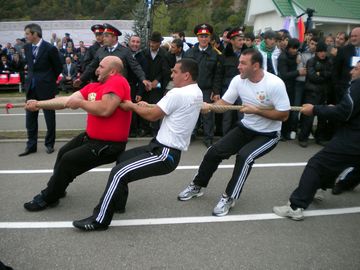 Ну а завершили программу самые эмоциональные соревнования - перетягивание каната. Здесь были стертые до крови руки спортсменов, сорванные голоса болельщиков, а победа - у сборной Ингушетии.