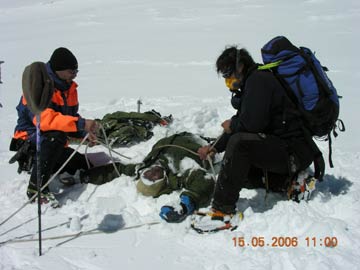 - Довольно часто, бывает, что мы помогаем человеку спуститься с высоты, допустим 4,200 метров над уровнем моря, а через 10 дней его же находим на высоте 5000 метров мертвым. Часто бывают просто уникальные случаи: женщина ушла в горы оставив предсмертную записку-завещание, в которой подробно расписала куда девать и как распоряжаться ее материальным благосостоянием. У нее был девиз: "Альпинист не должен умирать в постели". Наши сотрудники перехватили ее в пути, в "Приюте-11" и три дня уговаривали вернуться. Удалось ее вернуть и отправить домой. На тот момент ей исполнилось 58 лет. Но этим дело не закончилось.