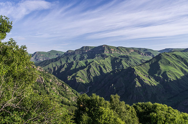 После Долины начинается затяжной подъем, в конце которого точно стоит остановиться, чтобы полюбоваться на Кавказский хребет и сделать прекрасные фото. Дорога еще несколько раз будет подниматься и спускаться. По сторонам встречаются стада коров и табуны лошадей. Есть несколько придорожных кафе, где можно перекусить хычинами или плотно пообедать шашлыком.