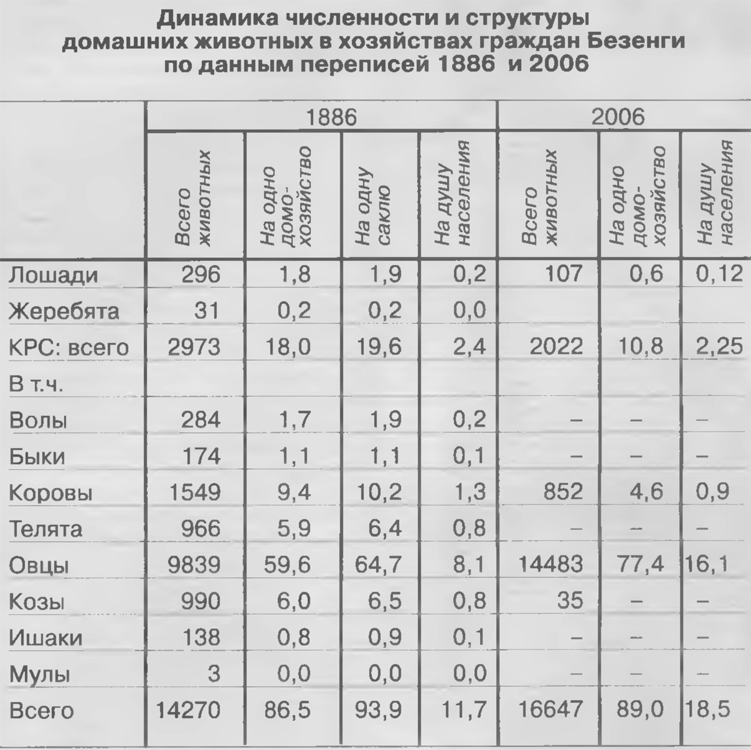Сопоставление данных 2006 с данными 1886 позволяет сделать следующие выводы. Общее количество домашнего скота в Безенги за 120 лет выросло лишь на 2377 голов, что означает 20 голов в год. Из них прирост наблюдается лишь по овцам (+4644 гол.), тогда как по лошадям (-189), КРС (-951), коровам (-697), козам (-955), ишакам (-138), мулам (-3) - т.е. по большинству видов домашних животных - абсолютное снижение. Причем в наибольшей степени снизилось поголовье коров, которые выступают основой традиционного рациона питания горца и хозяйственного быта. (Следует заметить, что расчеты, проведенные аспирантом Ж.Х. Боттаевым, показали наличие высокой корреляции численности населения горных поселений и коров. Кстати, на равнине и в степной зоне в качестве коррелянта чис-ленности населения выступают другие животные. Полагаю, вывод весьма примечательный и ценный). Наблюдаемое почти двукратное снижение численности коров в 2006 по сравнению с 1886, как заметил Боттаев, говорит о том, что в рационе питания безенгийца снизилось потребление молока и молокопродуктов. Т.е. предки в пятом-шестом поколении нынешних безенгийцев употребляли больше молочных продуктов, а это (пусть поправят медики и диетологи) благоприятно сказывалось на здоровье детей и взрослых. В то же время в расчете на одного человека общее число домашних животных за 120 лет выросло почти в 1,6 раза. Но при этом следует учесть, что численность жителей Безенги сократилась за 120 лет почти в 1,4 раза. Поэтому, если скорректировать, с одной стороны, численность домашних животных (выведя за скобки прирост численности овец), а с другой - численность населения, то окажется, что реально душевой показатель снизился, а не вырос. Полагаем, что такая корректировка более корректна, чем фактическая, т.к. она более точно отражает корреляцию численности животных и состояния биосферы (кормовой базы) в регионе. Таким образом, если внести предложенные коррективы в численность населения и структуры домашних животных, то душевой прирост оказывается даже отрицательным. Если перевести численность животных на мясо, то получается, что среднестатистический безенгиец в новом столетии потребляет мяса меньше, чем его предок в XIX в., при этом структура потребляемого мяса оказывается менее разнообразной и, по-видимому, менее калорийной. Таким образом, потребление молока и молокопродуктов, а также мяса и мясопродуктов у среднестатистического безенгийца в двадцать первом веке оказ-вается ниже, чем в девятнадцатом.