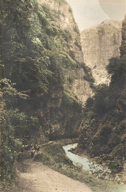 Лента асфальтированной дороги то поднимается к лесу, то идет почти рядом с рекой. Вдруг выбегает на поляну, откуда влево уходит узкое, но солнечное боковое ущелье. По его дну сбегает быстрая речка Адайсу. Многотонные обломки скал у начала ущелья говорят о мощи, которую обретает поток весной и в период дождей. С берега на берег перебирается тропинка. Через полкилометра ущелье заканчивается. С двухсотметровой высоты падает речка. Вверху видны высокие деревья, синь неба. Место фантастическое! Недаром здесь снимался затерянный мир кинофильма «Земля Санникова».