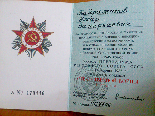 Умару Байрамукову едва исполнилось 17 лет, когда началась Великая Отечественная война. Славный ветеран дошел с боями до Берлина, был тяжело ранен. Байрамуков награжден орденом Боевой Славы третьей степени, орденом Отечественной войны, орденом Красной Звезды, медалью «За взятие Берлина».