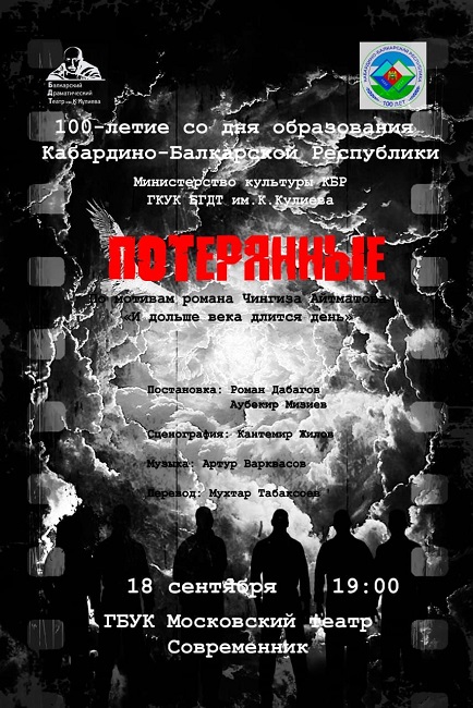 В рамках празднования Дней Кабардино-Балкарской Республики в Москве, Балкарский театр им К. Кулиева 18 сентября в 19:00 дает спектакль в Московском театре Современник "ПОТЕРЯННЫЕ" по мотивам романа Ч. Айтматова "И дольше века длится день".