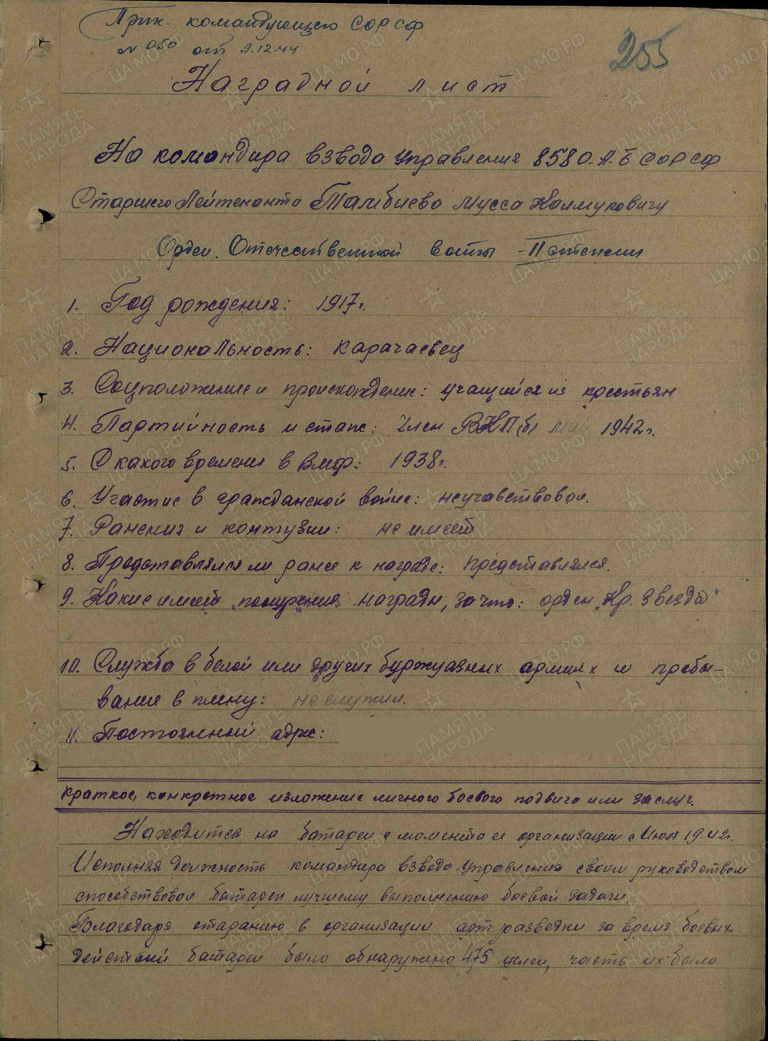 в РККА с 1940 года Место призыва: Мало-Карачаевский РВК, Карачаевская АО, Мало-Карачаевский р-н